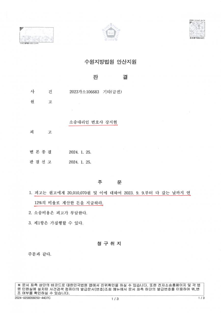 - 사건 : 수원지방법원 안산지원 2023가소119030호 - 판결요지 : 작성된 차용증을 근거로 약정금 청구를 구한 사건으로, 상대방은 위 차용증이 협박에 의해 작성된 것이라고 주장하였으나, 차용증 작성 경위 등을 소명하여 상대방의 주장을 반박한 사건