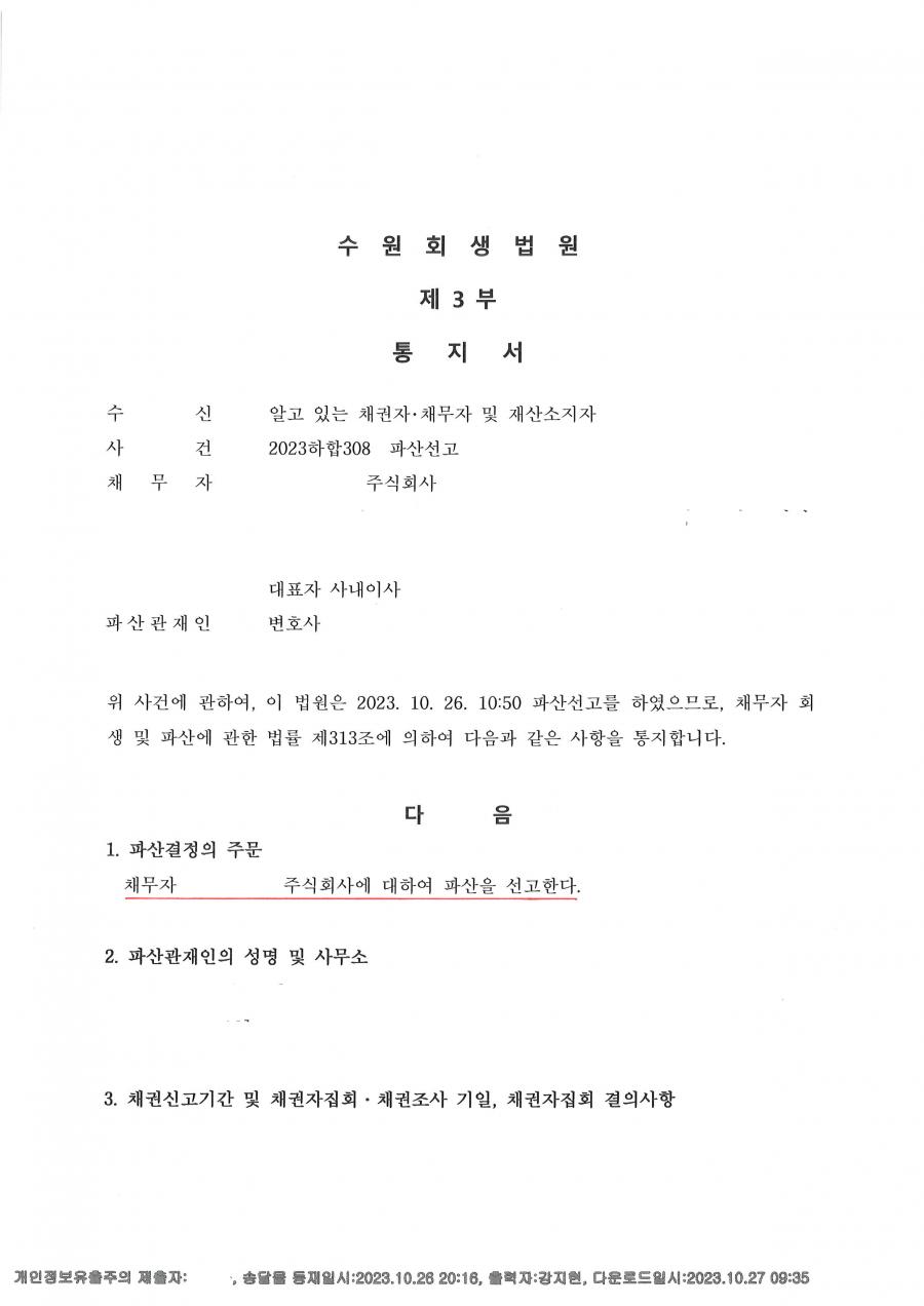 - 사건 : 수원회생법원 2023하합308호 - 판결요지 : 인건비, 물가상승 등을 사유로 단기적 유동성 위기를 겪게 된 법인이 이를 해결하기 위해 노력하였음에도 불구하고 부채의 총액이 자산의 총액을 현저히 초과하게 되어 법인 파산신청을 진행한 사건.