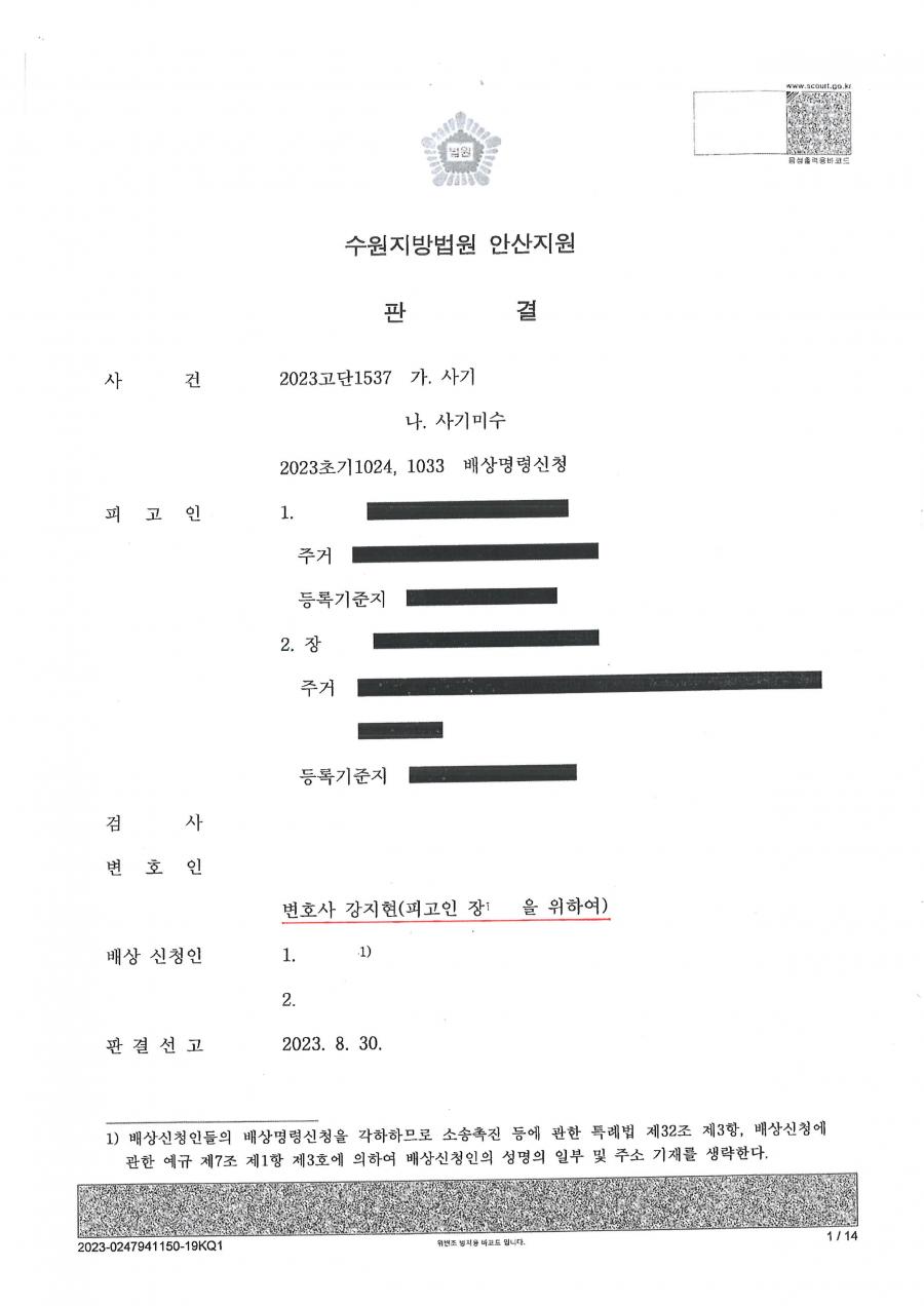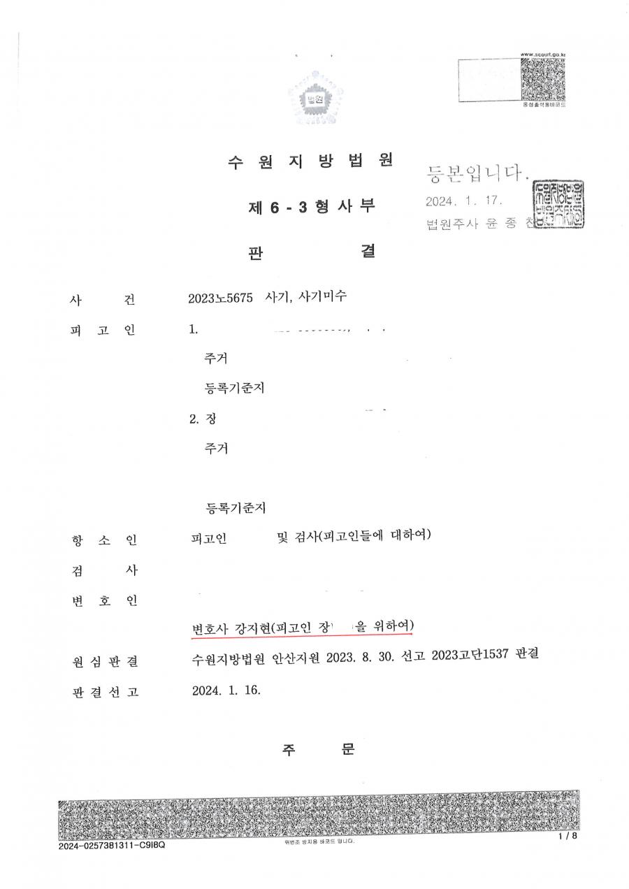 - 사건 : 수원지방법원 안산지원 2023고단1537, 20235675호 사기, 사기미수