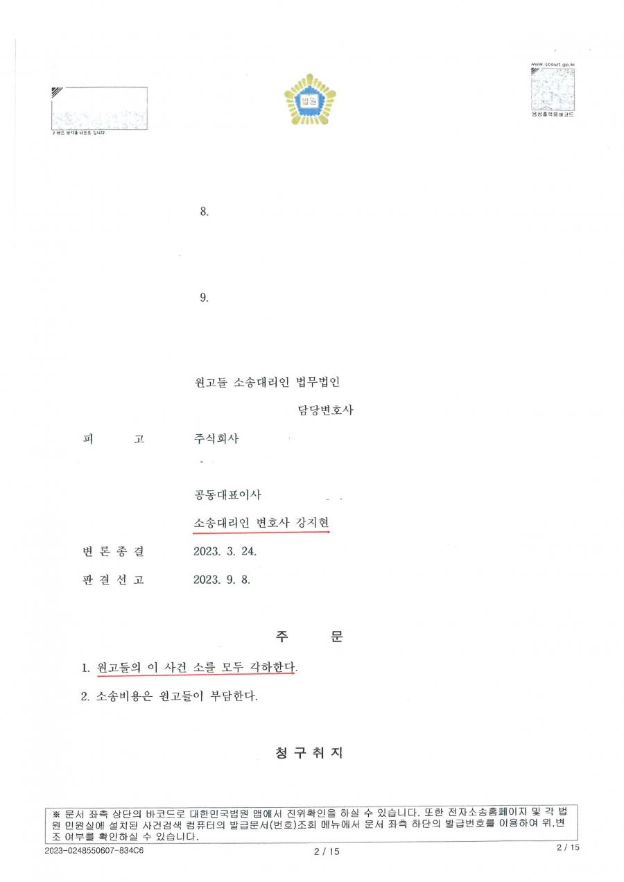 - 판결요지 : 근로자와 사측 양당사자는 서로에 대하여 제기한 임금 체불 소송 및 업무방해죄 형사고소 등을 원만히 해결하고자 일체의 민형사상 소송을 취하하는 내용의 내부협약을 체결하였음에도 불구하고, 사측이 근로자들에 대하여 제기한 업무방해죄 형사고소의 고소취하 및 처벌불원서를 제출하였음에도 불구하고 근로자들은 임금 소송의 소취하서를 제출하지 않은 사건. 근로자들은 미지급 임금 등 금원 전부를 보전하는 조건으로 소취하합의를 한 것이라는 취지로 주장하였으나, 협약의 구체적인 문언 내용과 그 전반적인 맥략 등을 살펴보았을 때 근로자들의 위와 같은 주장은 인정할 증거가 없으므로, 근로자와 사측 사이에 이루어진 소취하 합의는 유효하므로, 근로자들의 소는 권리보호의 이익이 없어 부적법하여 각하된 사건.