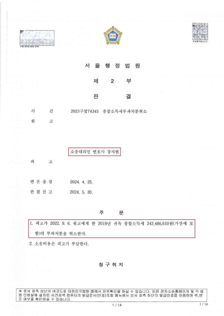 - 사건 : 서울행정법원 2023구합74345 종합소득세부과처분취소