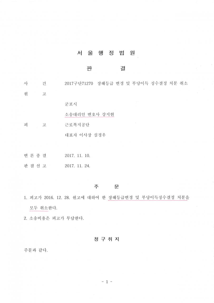 - 사건 : 서울행정법원 2017구단71270 장해등급 변경 및 부당이득 징수결정 처분 취소