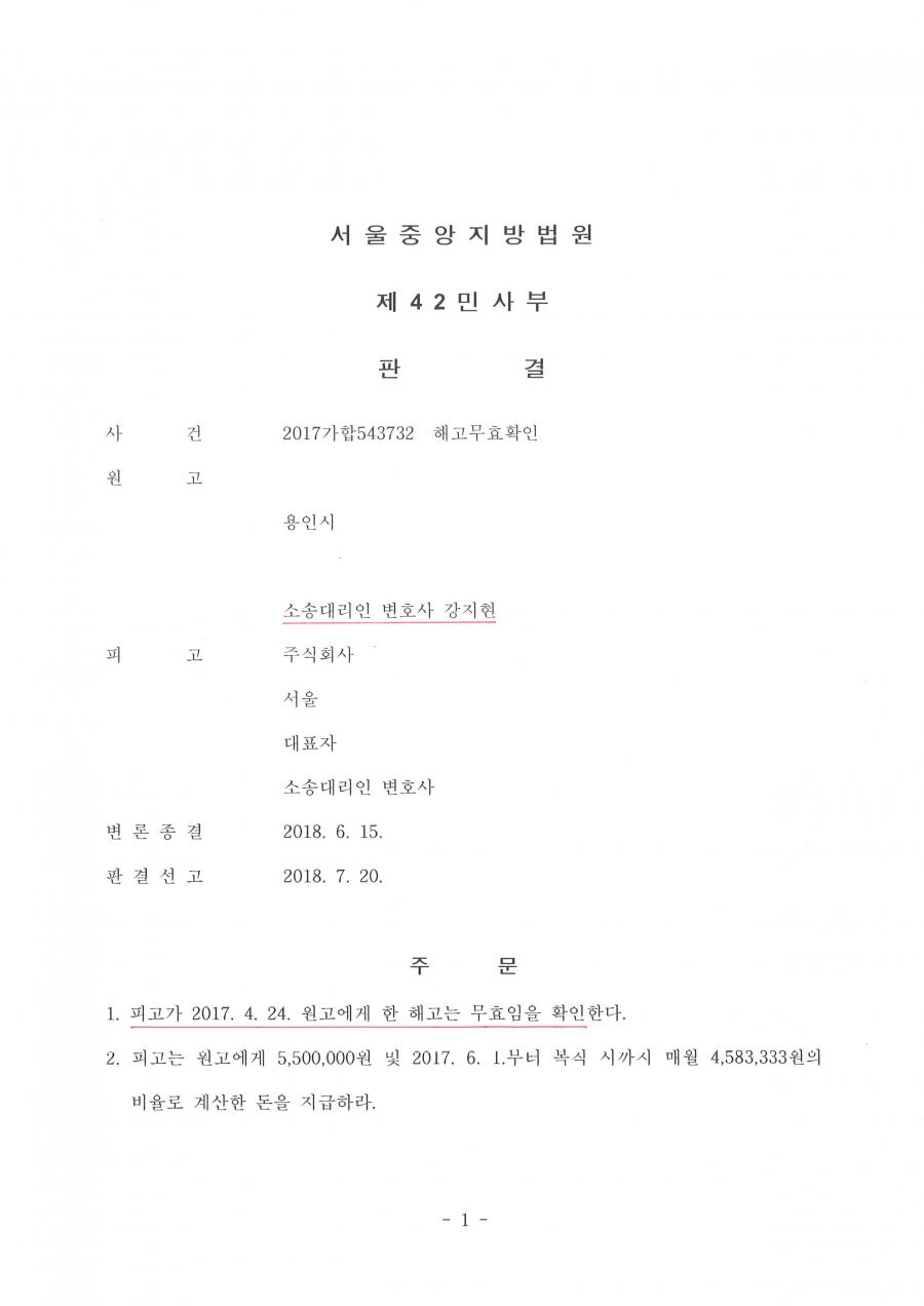 - 사건 : 서울중앙지방법원 2017가합543732 해고무효확인