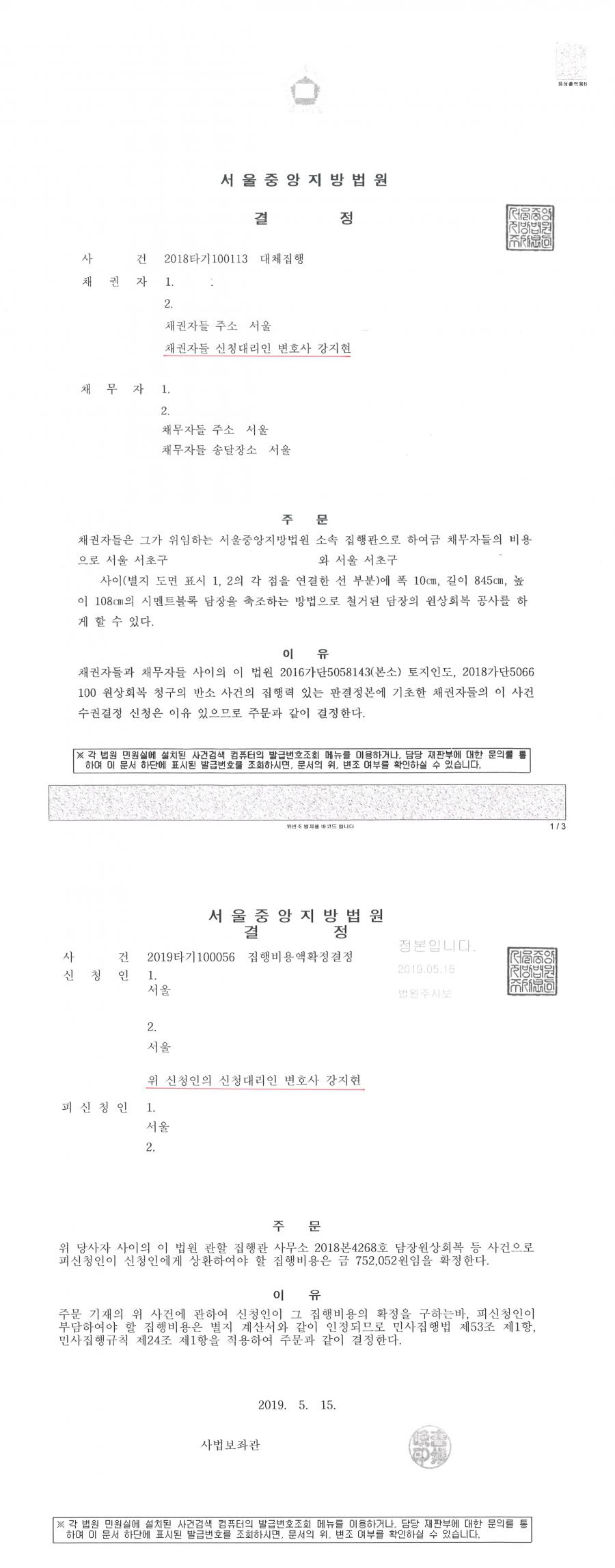 - 판결요지 : 인접한 토지에 의뢰인이 설치하였던 담장이 원고 자신들의 토지 지상에 축조되었다고 주장하며 철거를 구하는 소송에서 소송 진행 중 원고는 자력으로 담장을 철거하였고 원고의 자력구제에 원상회복 청구의 반소를 제기한 사건. 법원의 측량감정을 통하여 이 사건 담장이 토지의 경계선에 위치하였음을 입증하여 승소한 후 원고가 자발적으로 원상회복을 행하지 않아 대체집행신청을 한 후, 집행관을 통하여 담장설치 원상회복을 진행한 후 집행비용을 상대방에게 청구하여 받음으로써 법률 분쟁을 완료한 사건.
