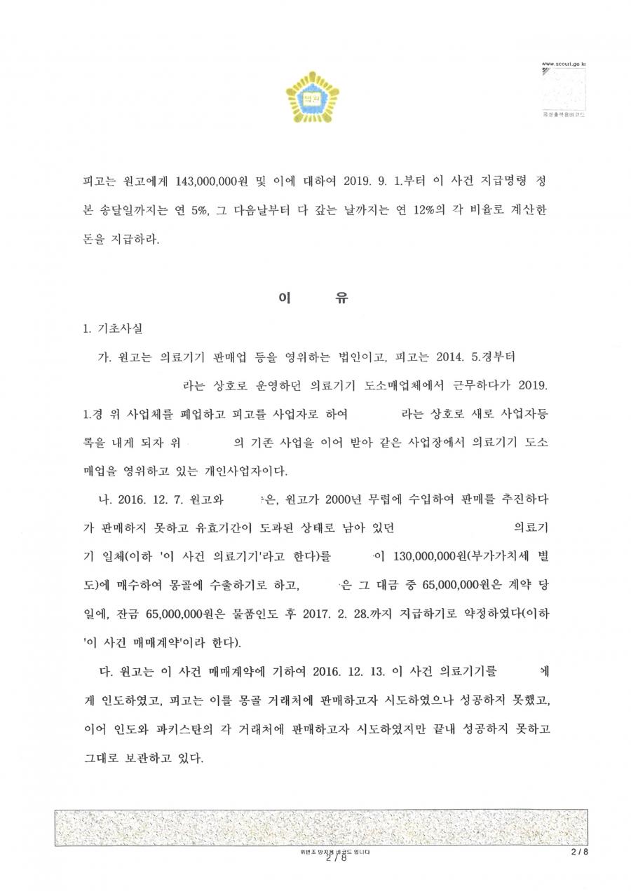- 판결요지 : 의료기기 판매업을 영위하는 원고가 의료기기 도소매업을 영위하는 개인사업자인 피고에게 유효기간이 도과된 이 사건 의료기기를 해외에 판매할 것을 권하면서 매매계약을 체결하고 상환계획서를 받은 후 이 사건 의료기기의 매매대금의 지급을 구하는 소송에서 원고와 피고 사이의 매매계약 자체가 사용기한 또는 유효기간이 지난 의료기기 판매를 금지하는 강행법규에 위반하여 무효이고, 이 사건 의료기기 판매가 법률적으로 불가능한 원시적 불능인 계약이므로 무효임을 근거로 매매대금 지급 약정 자체의 효력을 부정한 사건. 피고 주장의 의료기기법의 강행법규의 성질을 그대로 인정하여 이 사건 매매계약 자체가 무효로 인정받은 사례.