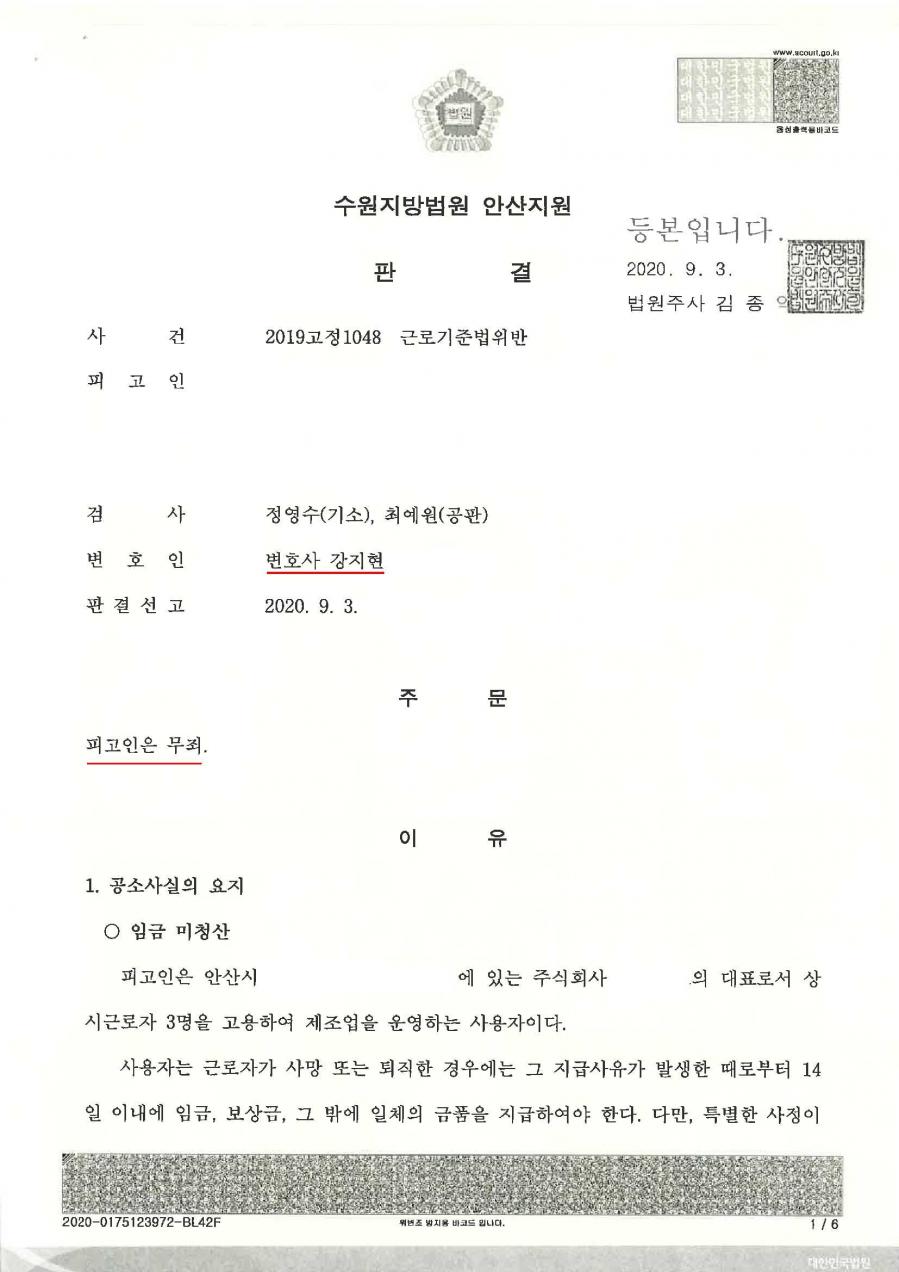- 사건 : 수원지방법원 안산지원 2019고정1048호 근로기준법위반