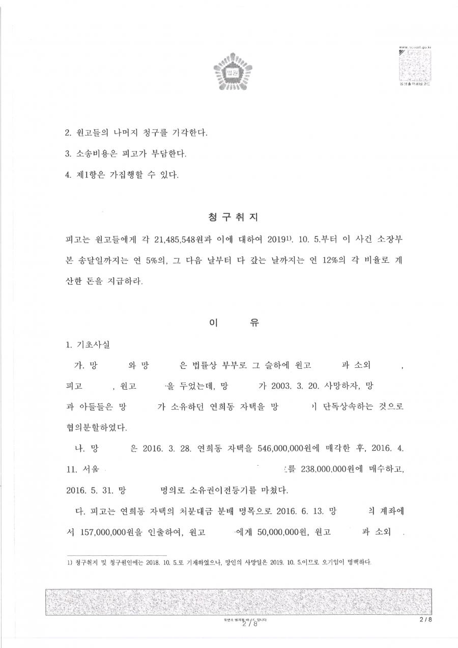 - 사건 : 2021가단5084436 유류분반환 청구의 소